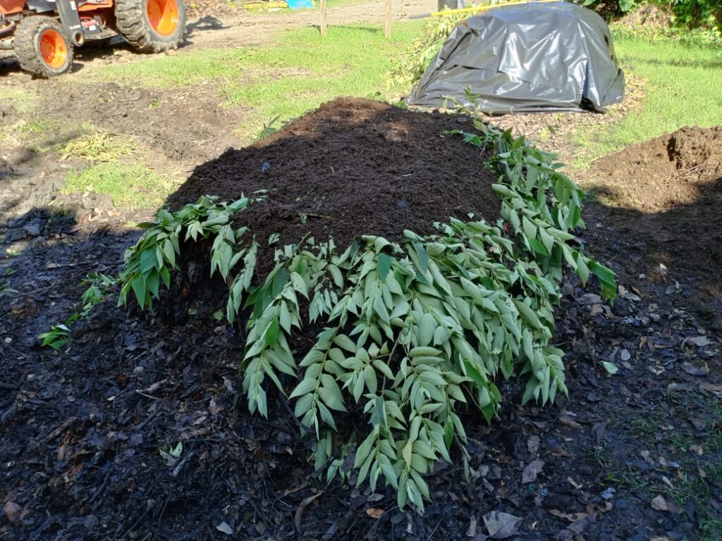 Building each heap follows a precise layering process with branches and twigs creating an aerated base, followed by 10 to 12 inches of dry material. A PVC pipe inserted through the center allows water and oxygen to reach the core of the heap. Green material, manure, a thin layer of ash and mature compost or topsoil complete the structure. The team waters each heap to maintain a humidity level of 60%, covers it and logs progress on a maintenance calendar.