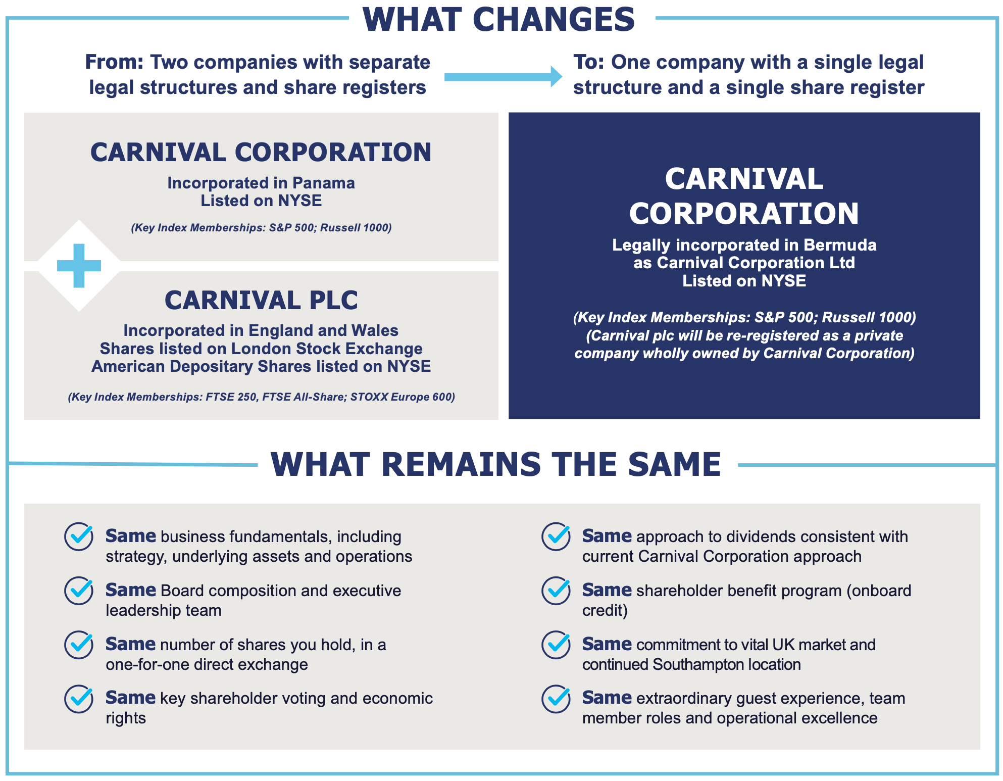 This communication contains statements herein regarding the proposed unification and redomiciliation transactions, future financial and operating results, benefits of the transactions and any other statements about future expectations that constitute forward-looking statements within the meaning of the Private Securities Litigation Reform Act of 1995, Section 27A of the Securities Act of 1933 and Section 21E of the Securities Exchange Act of 1934. All statements in this communication, other than statements of historical fact, are forward-looking statements that may be identified by the use of words “anticipate,” “believe,” “could,” “estimate,” “expect,” “intend,” “may,” “plan,” “potential,” “predict,” “project,” “should,” “target,” “will,” “would” and, in each case, their negative or other various or comparable terminology. Such forward-looking statements are based upon current beliefs, expectations and discussions related to the proposed unification and redomiciliation transactions and are subject to significant risks and uncertainties that could cause actual results to differ materially from the results expressed in such statements. There are a number of important factors that could cause actual results or events to differ materially from those indicated by such forward looking statements, including: the ability to obtain governmental and court approvals of the transactions on the proposed terms and schedule, the failure of Carnival Corporation and Carnival plc shareholders to approve the transactions, the effects of industry, market, economic, political or regulatory conditions outside of the parties’ control and the parties’ ability to achieve the benefits from the proposed transactions. Additional factors that may affect future results are contained in Carnival Corporation’s and Carnival plc’s filings with the SEC, including Carnival Corporation’s and Carnival plc’s most recent joint Annual Report on Form 10-K, as it may be updated from time to time by quarterly reports on Form 10-Q and current reports on Form 8-K, all of which are available at the SEC’s website http://www.sec.gov. The information set forth herein speaks only as of the date hereof, and, except to the extent legally required, any intention or obligation to update any forward-looking statements as a result of developments occurring after the date hereof is hereby disclaimed.